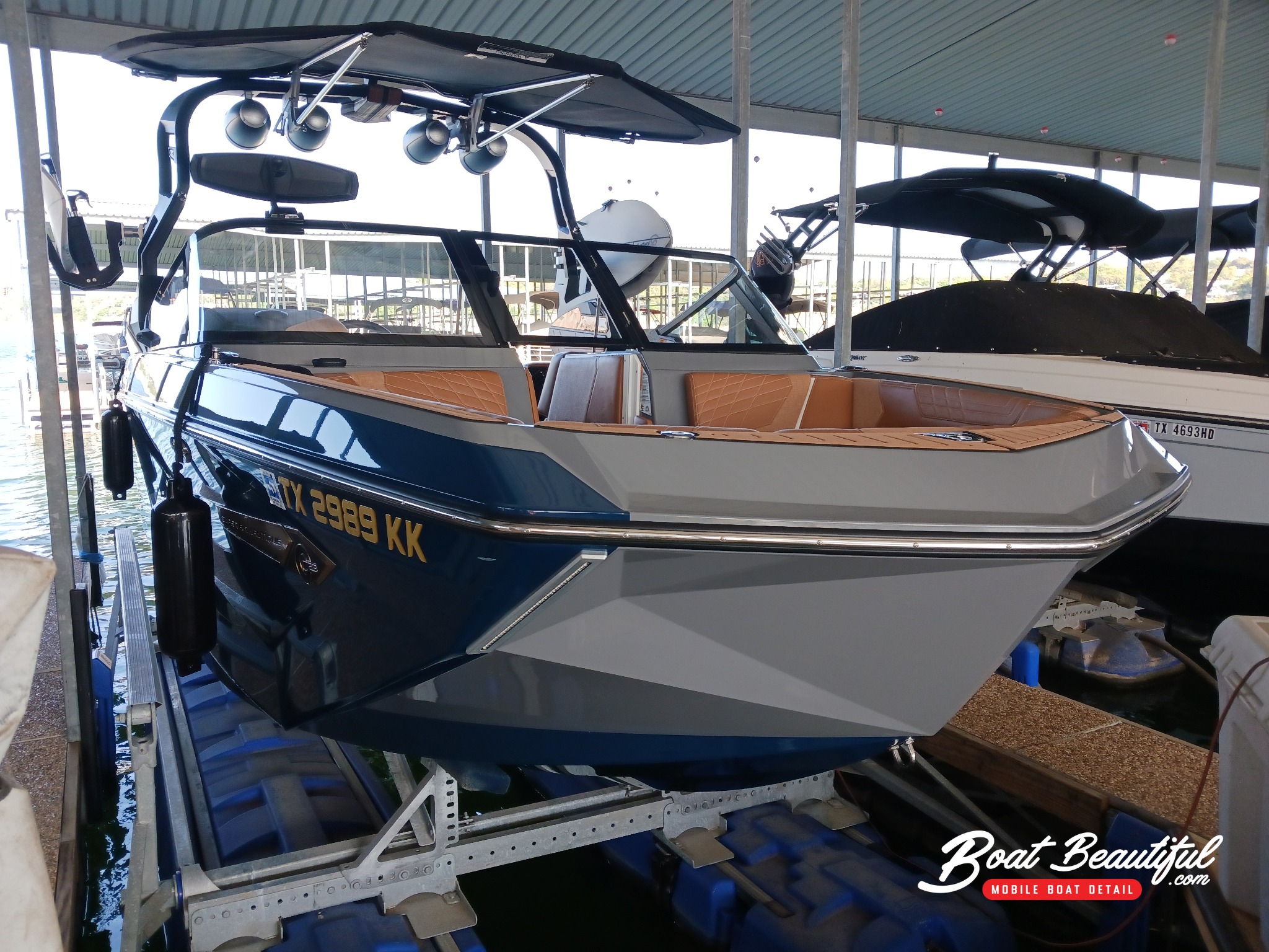 Boat ceramic coatings work by creating a smooth, high-gloss surface that accentuates your boat’s natural gloss and shine. At Boat Beautiful, we use premium ceramic coating formulas with our boat ceramic coating package that elevates the color and clarity of your boat’s finish. This enhanced look and brilliant shine ensures your boat remains a focal point on the water, drawing admiration and compliments from onlookers.